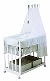 - inkl. Vliesmatratze, Bettwäsche, Inlett, Himmel und Himmelstange, mit Kufen zum Wiegen und Rollensatz Ablagefach aus Stoff mit 2 Stoffboxen, TÜV-geprüfte Sicherheit, zerlegt verpackt